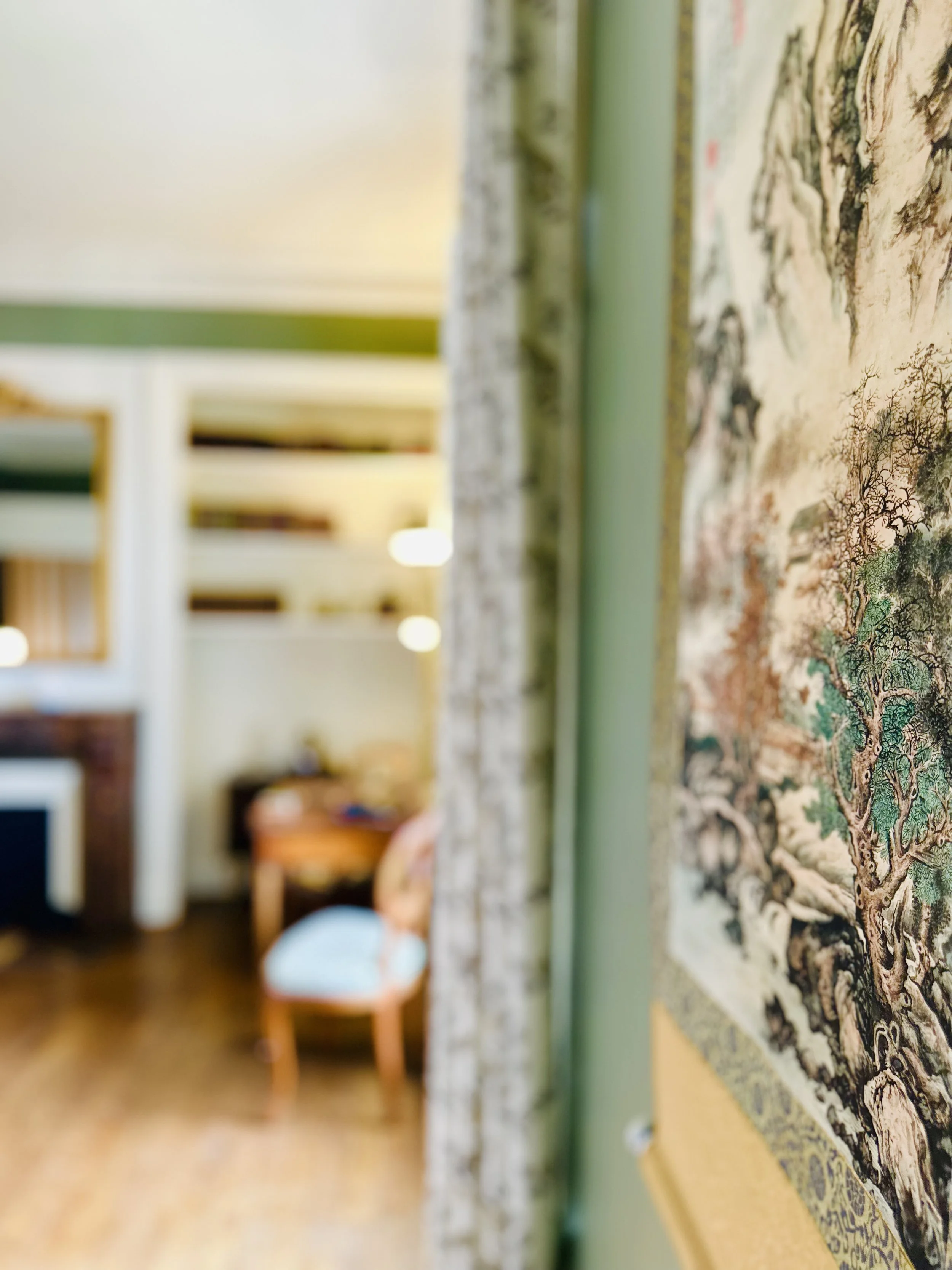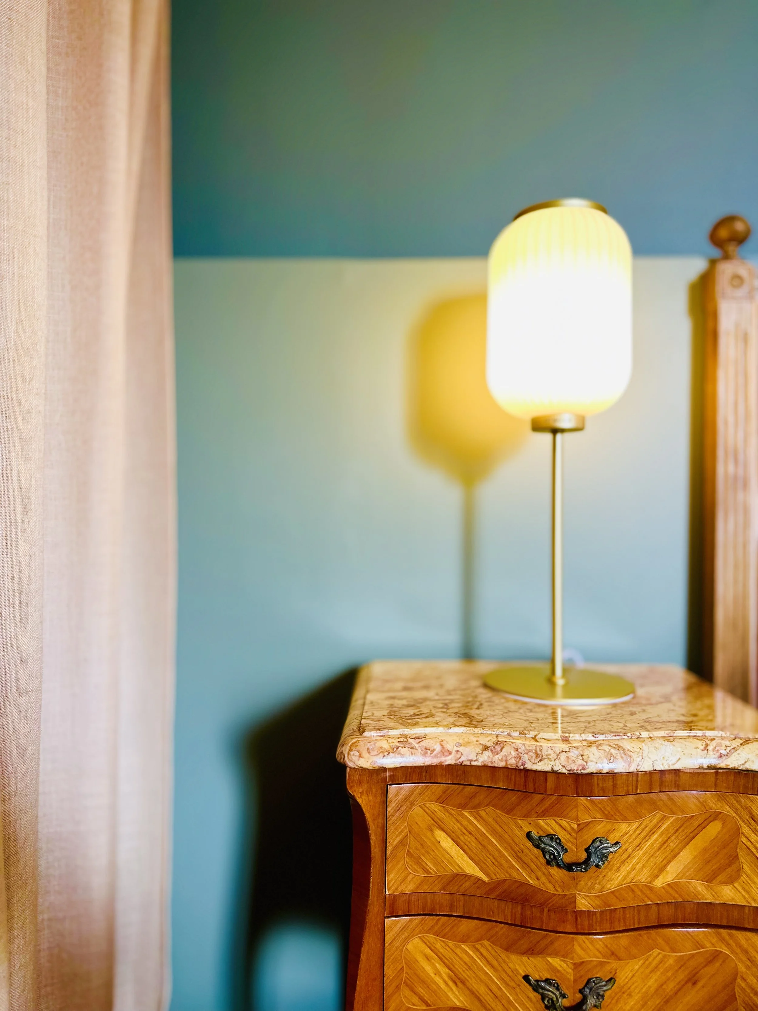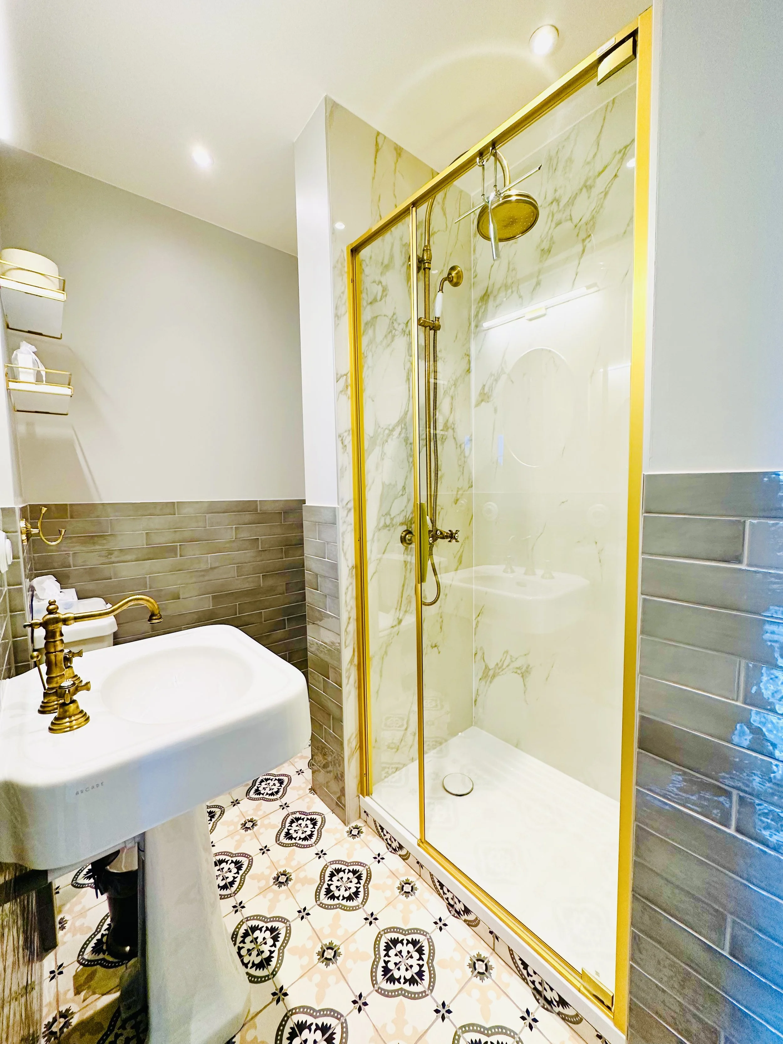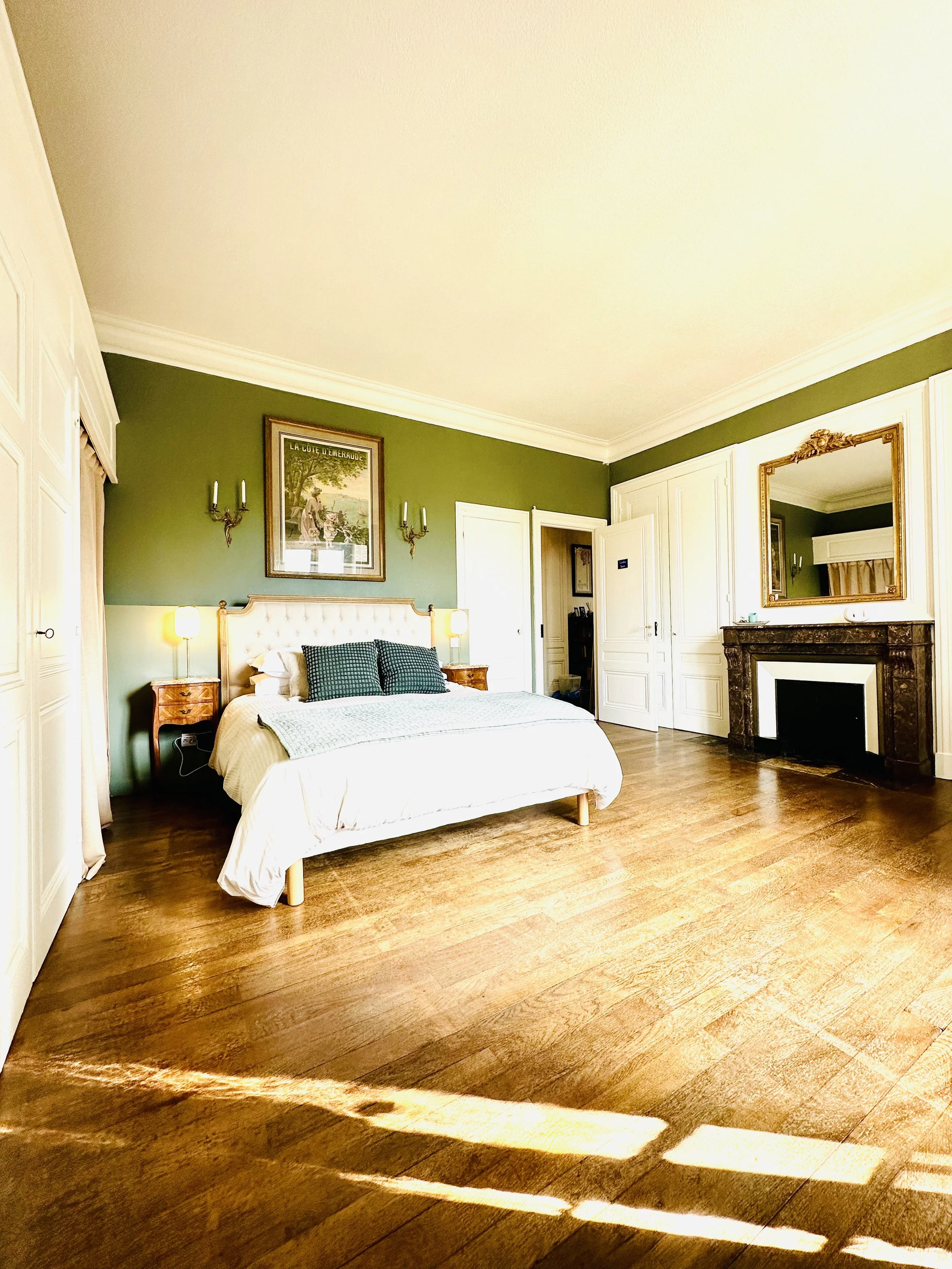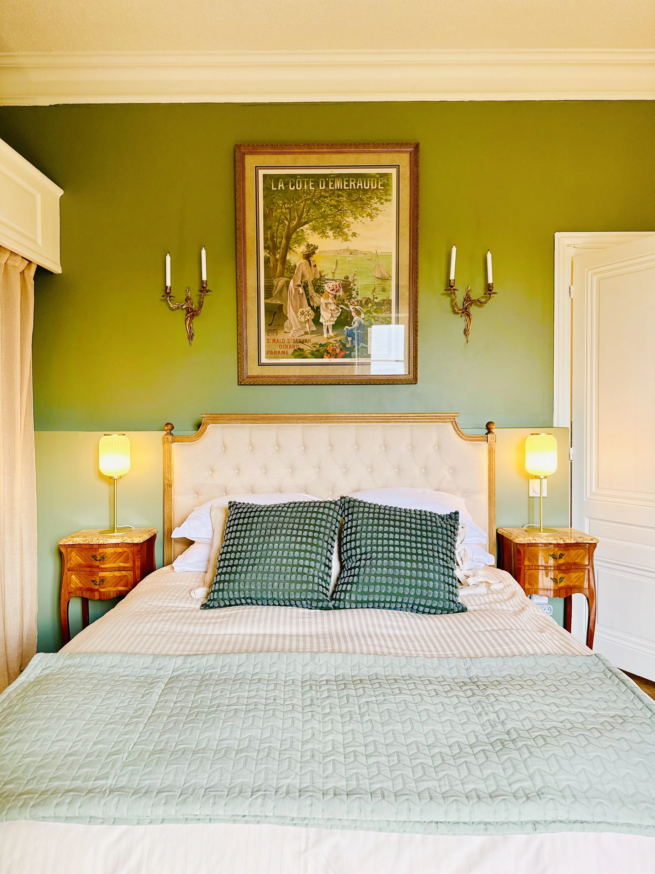 This charming suite, dare I say it, started with an exposed shower IN THE BEDROOM. Thankfully, we corrected this little “situation” & the suite now has a delightful en-suite bath. This “chambre” is located at the rear of the Château & overlooks our lovely garden.