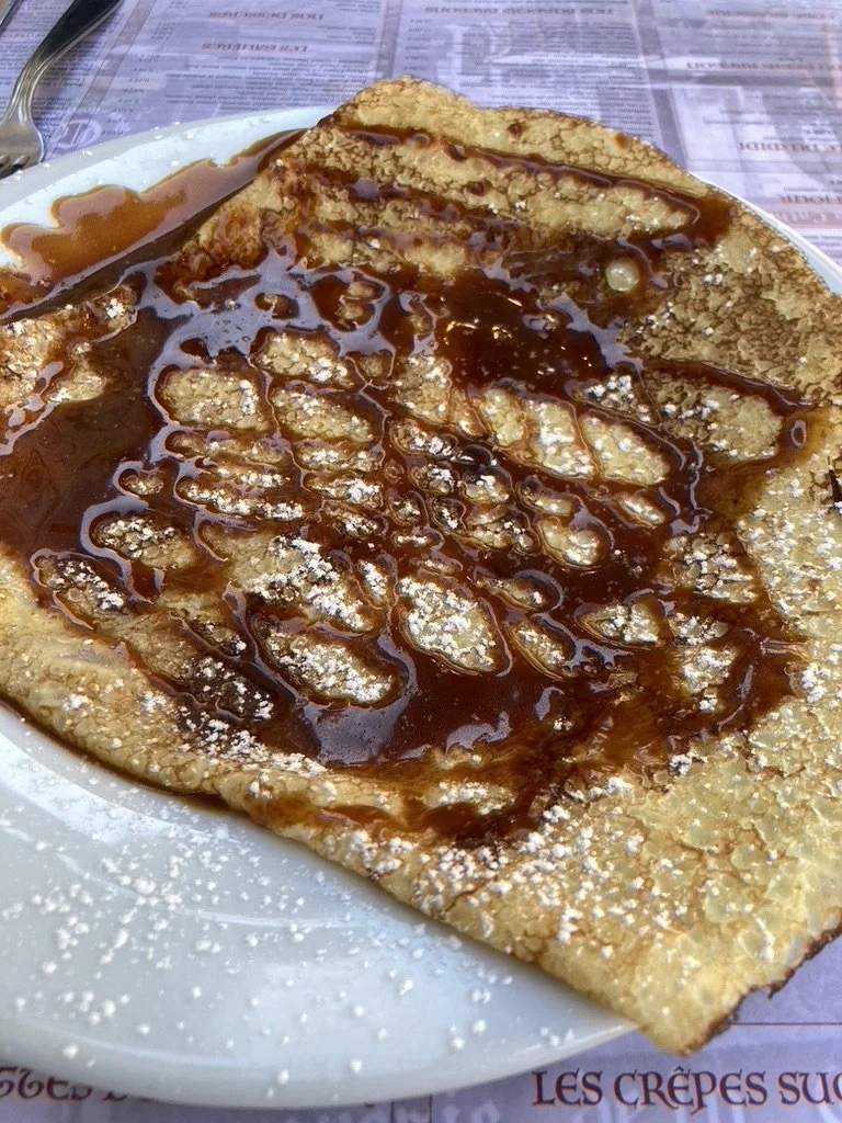 Oh la la. Crepes caramel are an experience…the ingredients are simple, we use them everyday. BUT, in combination, they create nirvana. The picture is of crepes that I ate on our last trip to France (Oct 21). I’ve made them a number of times & it’s always the same…how many can you eat without looking too greedy!! It takes a bit of panache to swirl - but part of the trick is to keep swirling once you start. Advanced crepe makers will start to work on the flip, which is fun, but egads one might end up on the floor. Quelle horreur!